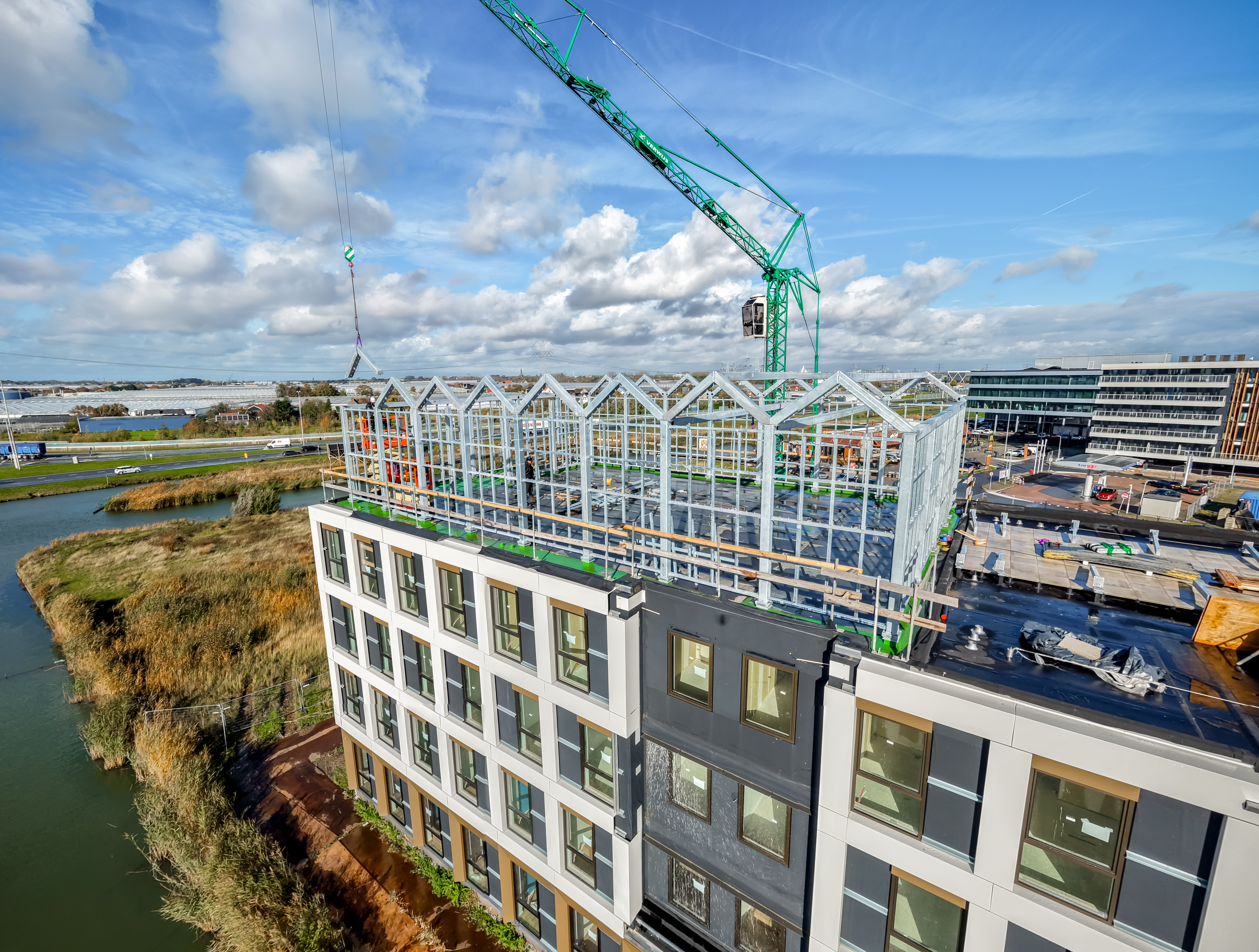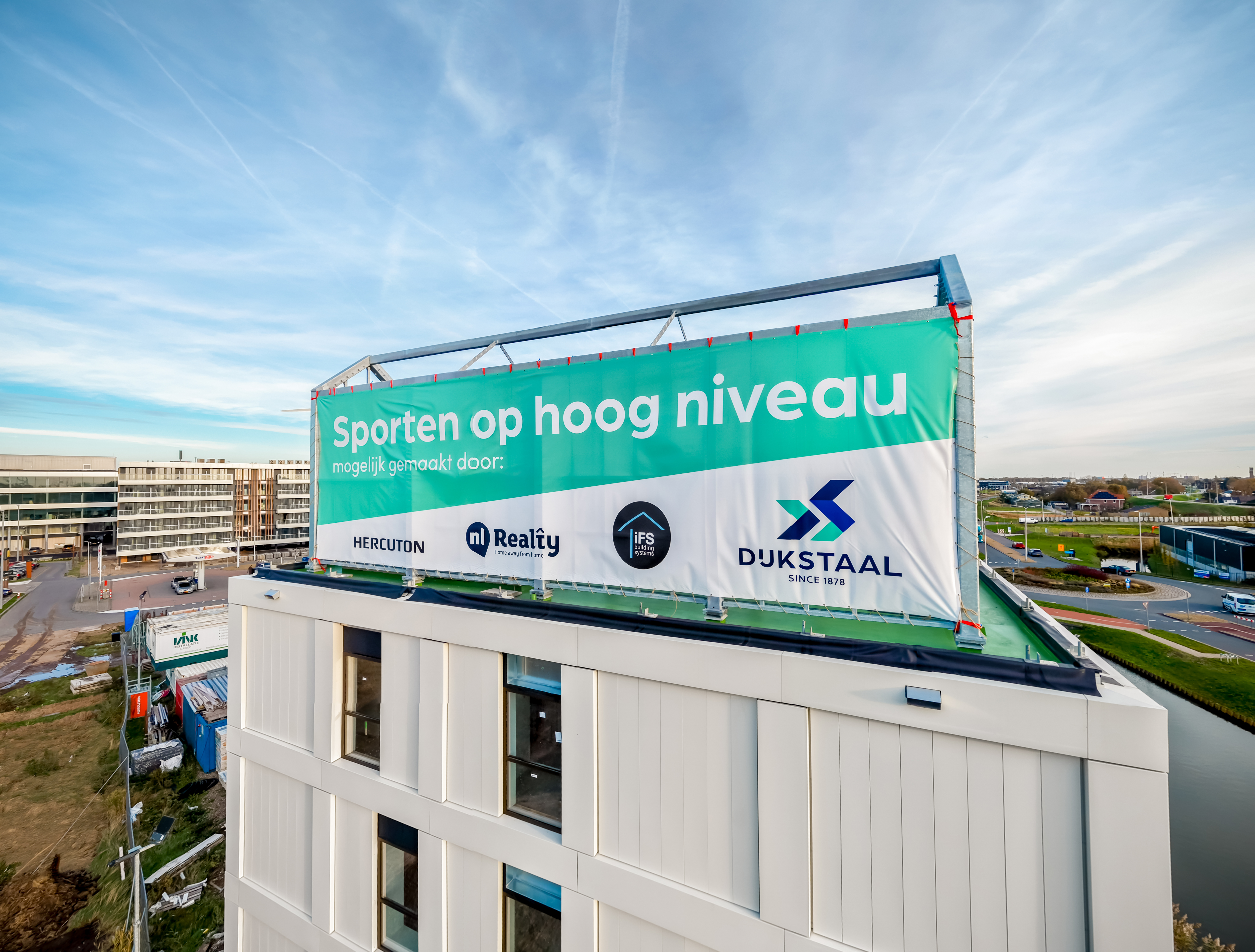Voor wooncomplex Homeland in Maasdijk realiseerden wij de complete staalconstructie voor een sportkooi op het dak van het gebouw. Een bijzonder project waarin architectuur, techniek en samenwerking samenkomen en waarbij werken op hoogte een belangrijke rol speelde.